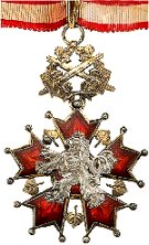 Order of the White LionThe order was created as an award for merits for the Czechoslovakia for foreign citizens by the Czechoslovak government in 1922. The Order was established in five classes and two divisions, civil (with two crossed palms above the badge) and military (with two crossed swords above the badge). The numbers of recipients had been limited, but limits were changed during following years. The Statutes of the order were amended in 1924, 1930 and 1936. Medals were in gold and silver. The badge of the Order was five arms red enamelled star, ends with small balls, between the arms are leaflets. In middle of the star is silver lion from national Coat of Arms. The reverse or the Star is red enamelled with Coat of Arms of the former parts of Czechoslovakia (Bohemia, Moravia, Silesia, Slovakia and Carpathian Russia). 1st Class with collar - reserved for heads of state, introduced in 1924 and collar can be awarded separately. |
