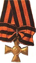 Like the Order of St. George, the Cross of St. George was awarded for acts of distinction under arms. An enlisted man or NCO would be awarded the 4th class cross for his first brave act. A second notable act could then bring him the 3rd class cross, etc. The first class and second class were in gold, the first class with a bow on the ribbon. The third and fourth classes were in silver, the third class marked by a bow. The ribbon was the same as for the Order of Saint George.
