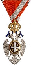 has the gold circumscription FOR FREEDOM and the date 1804, (this date being the awakening of the Nation from its Turkish oppressors). Reverse red medallion has a white eagle, the circlet has the wording PETER I 1904. An open crown surmounts the cross. Ribbon Military: Red. Ribbon Civil: Red with white edge stripes.