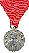 Obilich Medal for Bravery in gold or silver according to class. Obverse has the armour clad head and shoulders of Obilich the warrior surrounded by his title MILOCH OBILICH. Reverse a cross pattee with crossed swords between the arms, centre the words FOR BRAVERY encircled by a wreath of laurel. Ribbon: Red. The two classes are divided into Gold Medals (or silver gilt) for officers and Silver Medals (or silvered bronze) for non