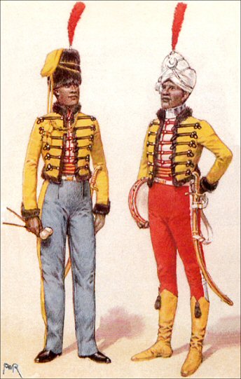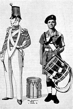 In 1795 the members of the Regiment available for overseas service were sent to Grenada as the 1st Battalion to quell a revolt, and a 2nd Battalion was formed from ineffectives and those who had not returned from service with the Fleet. The 1st Battalion, much reduced by battle casualties and disease, returned the following year and joined the 2nd Battalion, which was disbanded. Before leaving Grenada six black drummers were transferred to the West India Regiment. As none of their names had appeared on any previous roll, it can be concluded that they had been enlisted locally. In 1802 the 29th left for service in Nova Scotia (Canada) and in 1805 three black drummers were enlisted in Halifax, to join at least eight others already serving. The Regiment returned from North America in 1807 and was stationed at Deal, where a visitor wrote: “We were enlivened by their excellent band; and their Corps of black drummers cut a fierce and remarkable appearance while hammering away on their brass drums.” The next year the 29th arrived in Portugal at the start of the Peninsular campaign, in which two black drummers died and three survived to be awarded the Military General Service Medal 1793 - 1814 when it was instituted in 1848; the relatives of those who had died in the mean time could not receive it. After the war the numbers of black drummers declined steadily. In 1821 an inspection report on the Band said there were only four “men of colour.” A year later it was said that 11 vacancies were reserved for black boys who were on their way from Africa, but there is no record of their enlistment. In 1829 there were “three black musicians, the remnant of a Corps of black drummers, two of whom had been 27 years in the Corps.” By 1833 but two remained, and the last one, George Carville, died in 1843 in India, whilst still serving. The illustration shows how the drummers were dressed in the 1830s, when flamboyant styles were popular in a time of peace. On active service the drummers would have worn proper military uniform. The original watercolour was painted by Percival William Reynolds (1860 -1937) from a description by Major Murchison who served in the 29th from 1831 to 1852, for part of which time he was Sergeant Major of the Regiment. |
