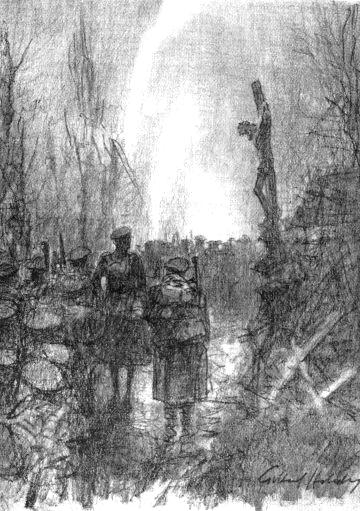 About half-a-mile behind the Line was a cross-roads known as "Rouge Croix" from a big crucifix of red wood which stood at the corner—on the right hand as one went towards the trenches. Several shells had struck near it, the top canopy had been shot away, and the whole crucifix was tilting a bit, but it still stood and will be remembered by many who passed it then and afterwards. That cross roads had become the recognised place at which troops going up to the Line got into single file for the final approach to the trenches. There the successive platoons used to get their distance-50 yards between the last man of one platoon and the first of the next. But this night the men stood and halted at this cross-roads, watching the platoon in front string out into single file and then disappear into the darkness in front, and being struck by the oddity of the silence in front in spite of the dazzling flares.