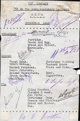 An important part of his duties were to ensure that the food prepared for the men was appetizing, clean and well-cooked. Supplies were dropped to us by parachute by the RAF. On special occasions, such as Christmas, appropriate menus had to be got ready. Below is an example of the menu prepared for Christmas Day 1944. In 1944 Christmas for the 7th Worcestershire Battalion was held at Kalemyo on the 18th December that year. General Slim had planned for the Battalion to attack Shebo in the Kabow valley on Christmas Day, before pushing them back to Mandelay. The Japanese would think the British would be celebrating Christmas and so it was hoped to take them by surprise. |