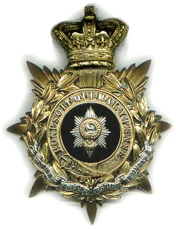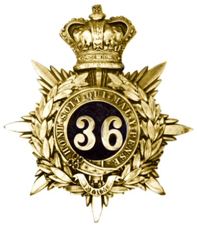 36th Regiment Helmet Plate (1878-1881) This is an 36th Regiment officers' helmet plate. This plate is very similar to that of the 29th Regiment. The plate was in Gilt with the '36' on a black leather background in the centre of the Garter. It will be noted that the Regimental Motto "FIRM" is on a scroll at the bottom of the wreath.