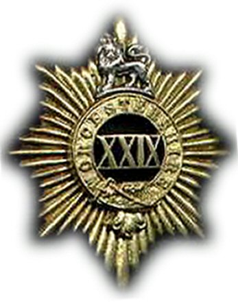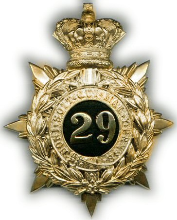 29th Regiment Helmet Plate (1878-1881) This is an 29th Regiment officers' helmet plate. The plate was in Gilt with the '29' on a black leather background in the centre of the Garter. This plate was not in universal use, as the regiment at the time were under orders for India, and officers were ordered to equip themselves with shakos instead of blue cloth helmets. |