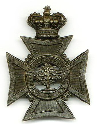1st Battalion Worcestershire Rifle Volunteers (1881-1895) Both battalions of the Worcestershire Rifle Volunteers adopted a Maltese cross type of plate. This example is in blackened brass and was worn by the lower ranks. Officers and staff-sergeants the plate was in white metal. There were many versions of this helmet plate with the Pear Tree. |