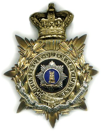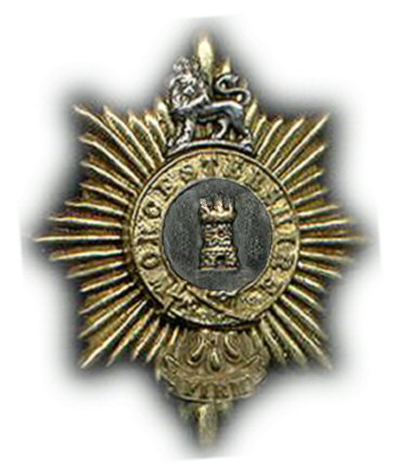 Worcestershire Regiment Helmet Plate (1881-1890) This officers' helmet plate was introduced after amalgamation of the 29th and 36th Regiment in 1881. The centre piece is a tower below which is the motto "FIRM". In 1883 the blue enamel at the centre was replaced with plain silver. |