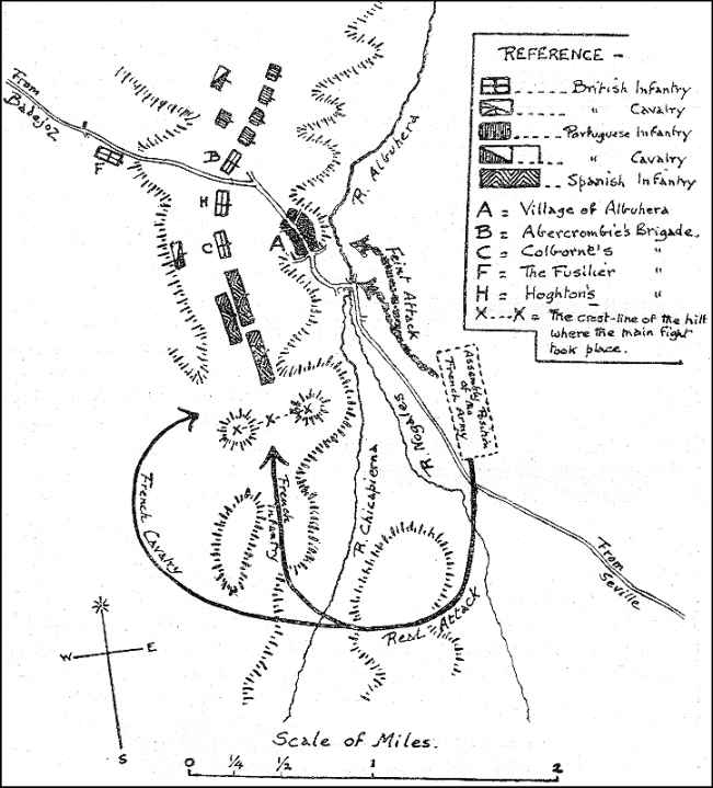 The Battle.—Early in the morning of May 16th, the French Army arrived before Beresford’s position at Albuera, and both sides deployed for battle. Beresford’s composite force consisted of about 9000 British (the 2nd and 4th Division of the British Army— 13 battalions, organised in 4 brigades, and 3 cavalry regiments), about 1000 Hanoverians (2 battalions of the King’s German Legion). 10,000 Portuguese (16 battalions and 8 squadrons), and 14,500 Spaniards, for Blake’s 12,000 had been joined by another small force under General Castanos—a total of some 35,000 of all arms.