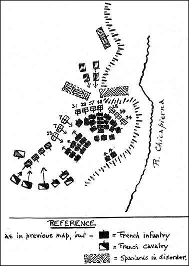 Unknown to Beresford, his great opponent, Marshal Soult, was in a similar crisis of irresolution. Only when his attack struck the Spanish battalions had he learned that Blake’s army had joined Beresford’s, so that instead of equal numbers he had heavy odds against him. In view of this he hesitated to commit his last reserves to the attack, but waited to see how his main body fared before sending in the final reinforcements, which might have ensured victory.