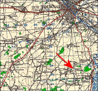 On 18th May 1940 there should have been a brief rest at Wez-Velvain, where the Battalion came into reserve and harboured for the night in the grounds of the chateau. But that night some enemy mortars ranged on to Battalion H.Q. and there were many casualties, among them a very gallant medical officer, Captain Jones.