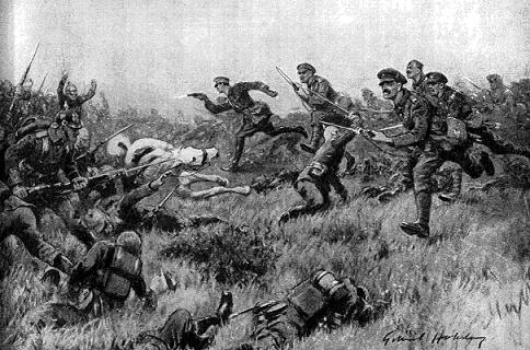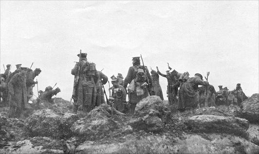 That bombardment was the heaviest experienced till then in any war, and the troops in the British front line saw the German trenches which they had faced all the Winter disappear in a whirlwind of flame and smoke. For half an hour the German lines were bombarded: then the artillery lifted from the trenches to the village in rear, and the battalions of the 23rd and 25th 'Brigades clambered out of their trenches and advanced to the assault.