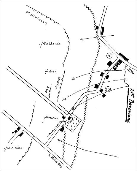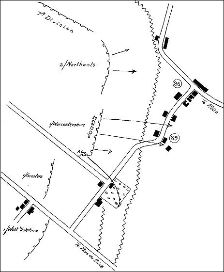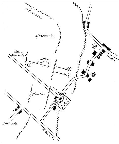 Meanwhile further to the left, the other three companies of the Battalion after a fierce bayonet fight had pursued the beaten enemy into their own lines. As his men flooded forward across the open, Colonel Wodehouse sent a message (that message is recorded by 24th Brigade Headquarters as having been received at 6.33 a.m.) to 24th Brigade Headquarters saying that the Battalion was advancing and asking that the artillery might be warned. Had the Brigade acted at once,. and had reinforcements followed in the wake of the Worcestershire, much might have been accomplished. As it was, the Battalion stormed the buildings in front (marked on the British maps as Point 85) and prepared to hold them against the expected counter-attacks. No support came, and the British artillery intermittently bombarded the captured buildings. Further to the left the Northamptonshire had made an attempt to follow up the enemy's retirement; but heavy loss brought their attack to a standstill, and in the mist the Worcestershire were not aware of their movement.