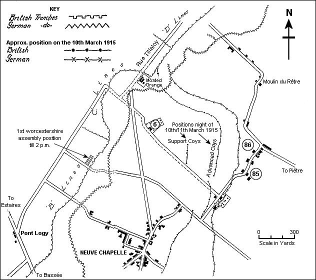 As planned, the attack was intended to crush the salient in the German line formed by the village of Neuve Chapelle, and thus to break a gap through the German defensive line. Through that gap the British reserves and cavalry were intended to push forward to seize the Aubers Ridge and possibly Lille itself. The 8th Division, which faced the Neuve Chapelle salient from the west, was to attack in the first phase, with the 23rd and 25th Brigades in front line and the 24th Brigade, which included the 1st Worcestershire, in reserve. The leading Brigades were to capture the village. Then the 24th Brigade was to push through the village and past the northern end of the Bois du Biez on to the Aubers Ridge. |