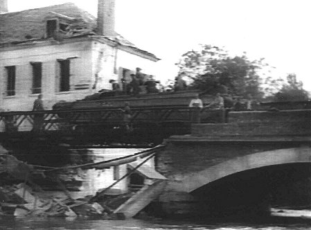 Crossing the damaged bridge over the river at Pacy-sur-Eure |