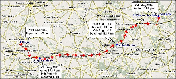 On the morning of the 22nd, the men were informed by their commanding officer, Lieut.-Colonel Osborne-Smith that they should be ready to move the next day. So it was that after breakfast on the 23rd August 1944 the 1st Battalion Worcestershire Regiment formed up on the streets of Berjou, boarded their T.C.V. (troop carrying vehicles) and joined the three battalions of the 129th Infantry Brigade. At 10.15 hours they were on the move. |