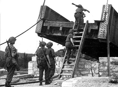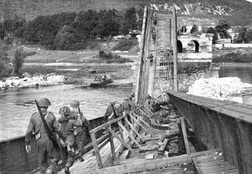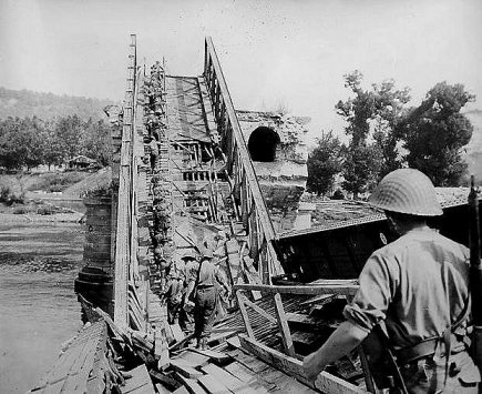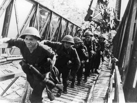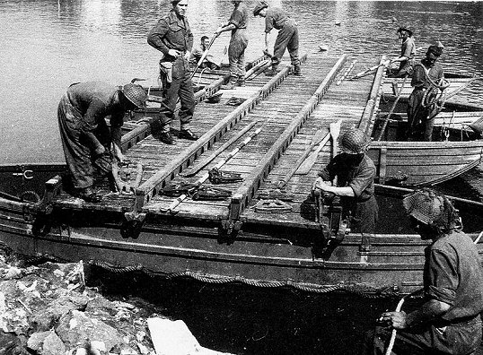 Troops cross damaged Vernon Road Bridge on wooden planks laid down by engineers the previous night. (IWM BU36348) |
