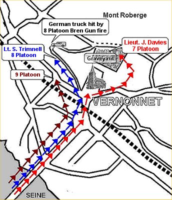 Private Tommy Dutton (17 Platoon, ‘D’ Company) recalls: “Moving off the bridge into the town of Vernonnet, we found it was badly damaged and still on fire, lots of buildings in a state of collapse. With brick-ends and debris under our feet we moved on down the street to a small church on our left; we moved up the side of this church, through the churchyard, up through the cemetery, over a fence into a small field beyond, which was surrounded by hedges. Suddenly there was an exchange of small-arms fire up ahead, 16 Platoon had encountered the enemy. The sun was well up now and rather warm.”