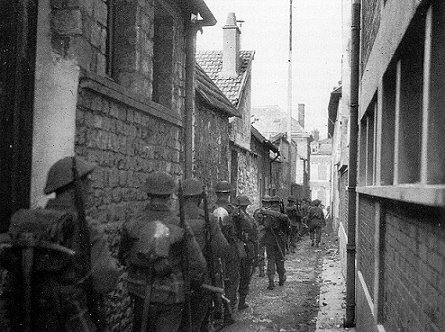 Private D. Hodgkins (13 Platoon, ‘C’ Company) recalls: "As the leading section of my platoon we were the first to encounter the enemy. As we moved round a corner we were greeted with a burst of light machine gun fire from enemy concealed in a garden behind a wall. With two of my colleagues we dashed into the nearest house and dashed upstairs to a bedroom window. From this vantage point we had a clear view of the enemy machine gun crew below – with a burst of our Bren gun the enemy were all killed."