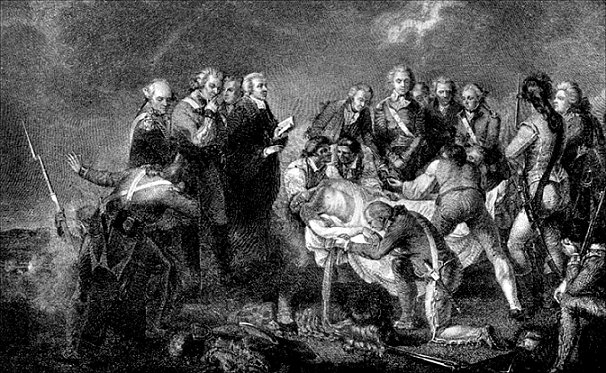 After describing the beginning of the fight, the historian continues:- "The contest now was fiercely maintained on both sides. The English cannon were repeatedly taken and re-taken; but when the grenadiers near them were forced back by the weight of superior numbers, one of the guns was permanently captured by the Americans, and turned upon the English............................................ On the British side the officers did their duty nobly; but General Fraser was the most eminent of them all, restoring order wherever the line began to waver, and infusing fresh courage into his men by voice and example. Mounted on an iron-gray charger, and dressed in the full uniform of a general officer, he was conspicuous to foes as well as friends. The American, Colonel Morgan, thought that the fate of the battle rested on this gallant man's life, and, calling several of his best marksmen around him, pointed Fraser out, and said: " That officer is General Fraser; I admire him, but he must die. Our victory depends on it. Take your stations in that clump of bushes, and do your duty." Within five minutes General Fraser fell mortally wounded, and was carried to the British camp by two grenadiers. Just previously to his being struck by the fatal bullet, one rifle-ball had cut the crupper of his saddle, and another had passed through his horse's mane close behind the ears. His aide-de-camp had noticed this, and said: "It is evident that you are marked out for particular aim; would it not be prudent for you to retire from this place ?" Fraser replied: "My duty forbids me to fly from danger," and the next moment he fell. (Lossing) Burgoyne's whole force were now compelled to fall back towards their camp. The left and centre were in disorder, but the light infantry (included the detachment of the 29th Worcestershire) and the 24th (later know as the South Wales Borderers) checked the fury of the assailants, and the remains of the column with great difficulty effected their return to camp, leaving six of their cannons in the possession of the enemy, and great numbers of killed and wounded on the field; and especially a large proportion of the artillerymen, who had stood to their guns until shot down or bayoneted beside them by the advancing Americans............................. When night fell (on the following day) it became absolutely necessary for Burgoyne to retire again, and, accordingly, the troops were marched through a stormy and rainy night towards Saratoga, abandoning their sick and wounded and the greater part of their baggage to the enemy. Before the rearguard quitted the camp, the last sad honours were paid to the brave General Fraser, who expired on the day after the action. He had, almost with his last breath, expressed a wish to be buried in the redoubt which had formed the part of the British lines where he had been stationed, but which had now been abandoned by the English, and was within full range of the cannon which the advancing Americans were rapidly placing in position to bear upon Burgoyne's force. Burgoyne resolved nevertheless, to comply with the dying wish of his comrade; and the interment took place under circumstances the most affecting that have ever marked a soldier's funeral ........... The American historian, Lossing, has described this touching episode of the campaign in a spirit that does honour to the writer as well as to his subject. After narrating the death of General Fraser on the 8th of October, he says that "it was just at sunset, on that calm October evening, that the corpse of General Fraser was carried up the hill to the place of burial within the 'great redoubt.' It was attended only by the members of his military family (see Note 3 below) and Mr. Brudenell, the chaplain; yet the eyes of hundreds of both armies followed the solemn procession, while the Americans, ignorant of its true character, kept up a constant cannonade upon the redoubt. The chaplain, unawed by the danger to which he was exposed, as the cannon-balls that struck the hill threw soil all over him, pronounced the impressive funeral service of the Church of England with an unfaltering voice. The growing darkness added solemnity to the scene. Suddenly, the irregular firing ceased, and the solemn voice of a single cannon, at measured intervals, boomed along the valley, and awakened the responses of the hills. It was a minute-gun fired by the Americans in honor of the gallant dead. The moment information was given that the gathering at the redoubt was a funeral company, fulfilling, amid imminent perils, the last-breathed wishes of the noble Fraser, orders were issued to withhold the cannonade with balls, and to render military homage to the fallen brave." |