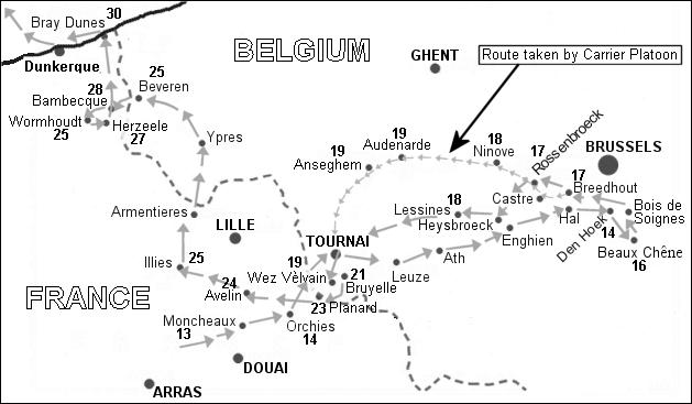 Planard was reached on the 23rd May 1940 and French troops were in position on the frontier. But their general attitude to the situation and the numbers of them who were roaming around lost and unarmed was not an encouraging background for speculation on the future. Nor was it possible to remain for long unmoved by the pitiable spectacle of refugees, old people, women and children, who, with their paraphernalia, crowded the roads everywhere and hampered movement. On 24th May the Battalion staggered into Avelin. They had covered some 200 miles in the last ten days, fighting all the way, and they were reaching the limits of human endurance. The supply system had broken down and there was precious little to eat. At the best low rations could only at moments be supplemented by buying and scrounging in the villages. At Avelin the Battalion tumbled into motor transport, and few were awake to note Armentieres, the Menin Gate and Ypres as they drove north-west to Beveren. It is difficult to know to what extent the fighting battalions of the 48th Division could follow the general situation. But the move to the north was an effort to hold the Germans who were pushing up the coast from the south. Though it was known that the French had collapsed, there was yet no talk of evacuation and Dunkirk was still just a name of another French port. A tribute is here due to the Divisional Cavalry Regiment, the 12th Royal Lancers, who had worked back with the Brigade to Avelin. It was comforting indeed at the end of the long night to march through their road-blocks and find their cars tucked into the hedges ready to help the Battalion in. Whether or not the decision of Dunkirk had been taken at this stage is hardly relevant to this story. The fact remains that there was news of a German tank formation moving up from the south-west, and from Beveren the 144th Brigade were sent off to meet and hold the threat in order to give the Division and other formations the freedom needed to reach the coast. |