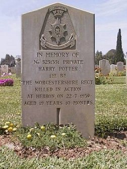 Harry Potter On the evening of 22nd July 1939, “D” Company, returning from As Samu, engaged an armed band at Kilo 39 on the Hebron-Beersheba road. This gang had earlier ambushed an R.A.F. armoured car. During the engagement Private Harry Potter (5251351) was killed and Privates Darby, Warwick, Pearson and Simmonds were wounded. Private Joseph Darby later died of his wounds in hospital in Jerusalem on 7th September 1939. |