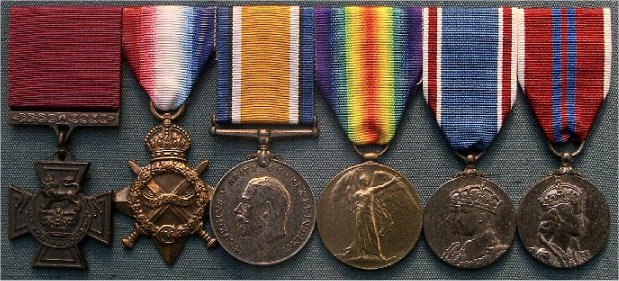 10th Battalion Worcestershire Regiment. (at the storming of La Boisselle) The strongly fortified village of La Boisselle, France was captured in a night attack, but with very heavy loss. All the senior officers were killed or wounded, and control was very difficult. Small parties, one of which was led by Lieutenant Jennings, pushed forward through the village, bombing, taking prisoners and picking up stragglers. Private Turrall, one of the Battalion bombers, joined the party; a hidden machine gun opened fire, and Private Turrall flung himself flat, escaping injury. All the rest of the party was killed, except Lieutenant Jennings, whose leg was shattered. Turrall dragged him to a shell hole, bandaging his leg with one of his puttees, and using the halve of his entrenching tool as a splint. They were bombed from behind a hedge by a party of Germans; Turrall shot two of them dead through a gap, and the others retired. Later in the day the Germans made an unsuccessful counter-attack on the village; the officer had fainted, so Turrall shammed dead successfully, although the Germans prodded him with their bayonets as they passed. |